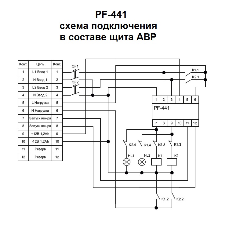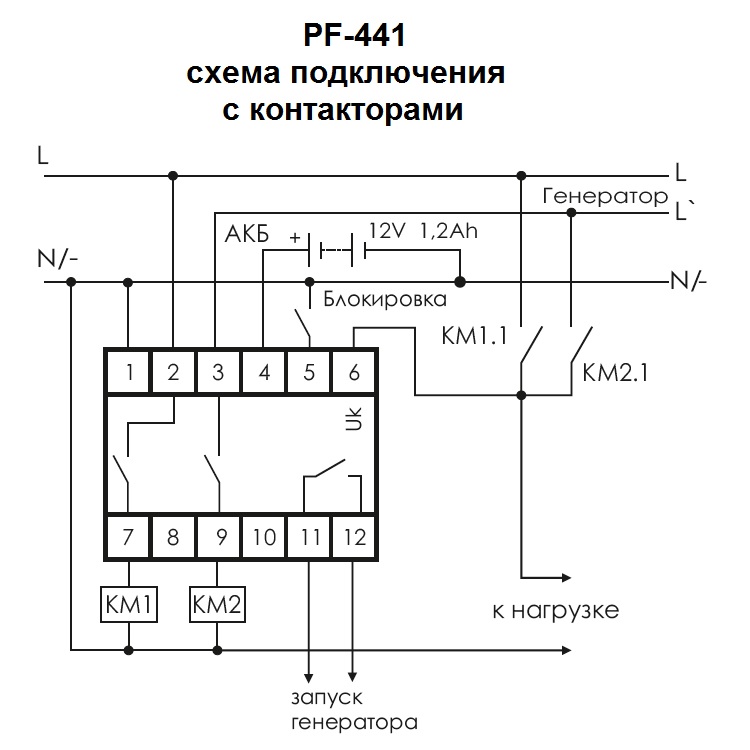 Если напряжение в сети в допустимых пределах, нагрузка через замкнутые контакты 2-7 подключена к сети. При выходе напряжения за установленные пределы контакты 2-7 размыкаются, и нагрузка отключается. Через 15 секунд замыкаются контакты 11-12 и подается сигнал на запуск генератора. После выхода его в рабочий режим (напряжение генератора стабильно и находится в допустимых пределах) контакты 3-9 замыкаются, и нагрузка подключается к генератору. При восстановлении напряжения в сети через 10 секунд контакты 3-9 размыкаются, через 0,3 секунды замыкаются контакты 2-7 и нагрузка подключается к сети питания.