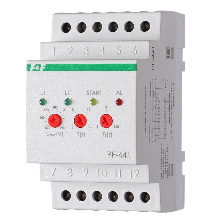 Переключатель фаз автоматический PF-441 предназначен для контроля напряжения в однофазной сети питания и переключения потребителей на резервный ввод от генератора при выходе напряжения в сети за установленные пределы.