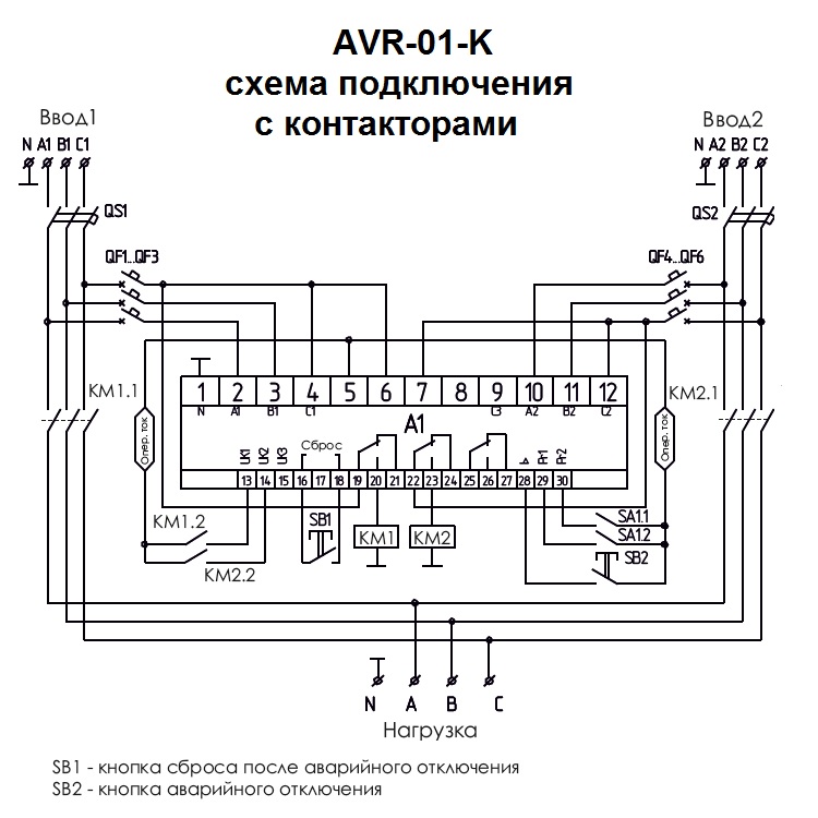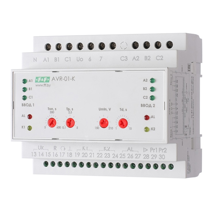Устройство управления резервным питанием AVR-01-K предназначено для построения блоков АВР с двумя вводами питания (два сетевых ввода или сетевой ввод и ввод от генератора) и одной нагрузкой.