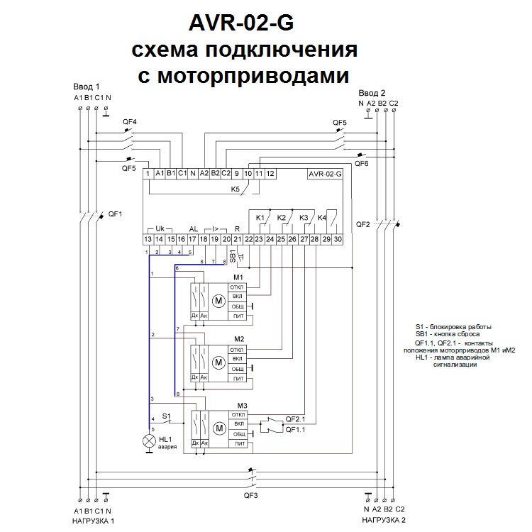 Устройство управления AVR-02-G предназначено для построения блоков АВР с двумя вводами питания (двумя сетевыми вводами или сетевой ввод и ввод от генератора), с секционным выключателем, с одной или двумя нагрузками.