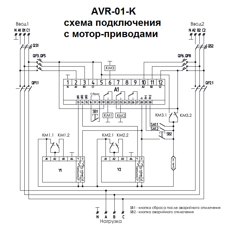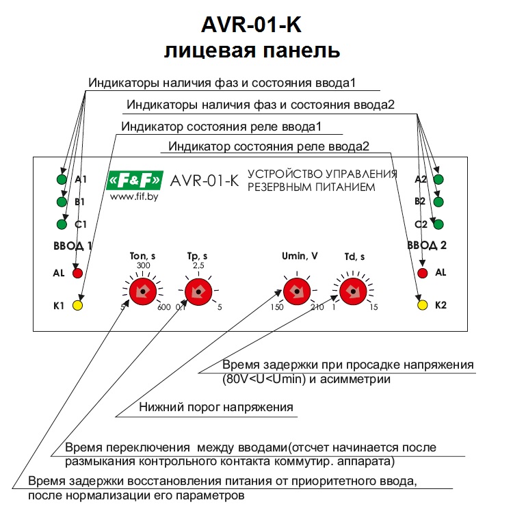 Устройство управления резервным питанием AVR-01-K предназначено для построения блоков АВР с двумя вводами питания (два сетевых ввода или сетевой ввод и ввод от генератора) и одной нагрузкой.