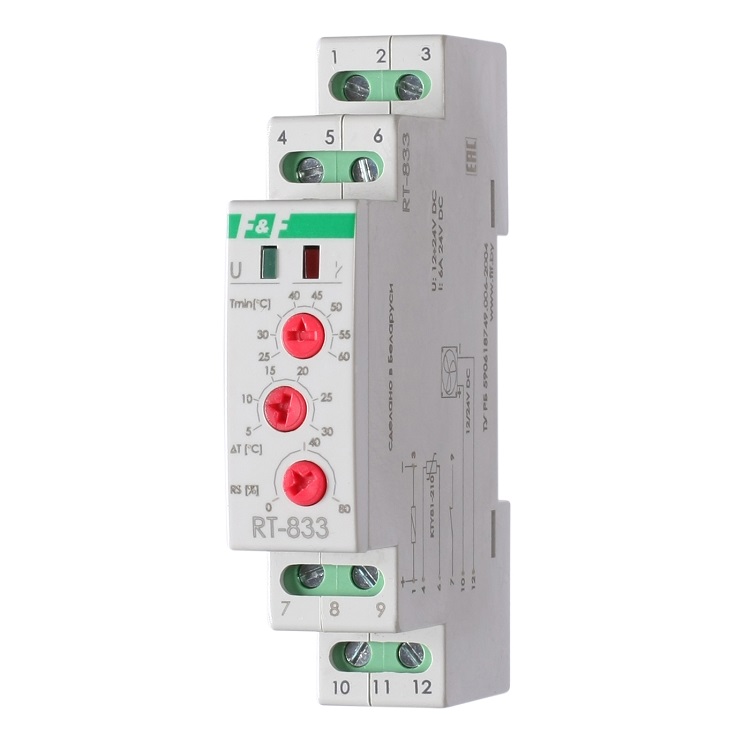 Напряжение питания 12-24 В AC/DC, Диапазон от +25 до +65 гр., Гистерезис 5-30 гр., Контакт 1NO/NC, Максимальный ток 8 А (6 А). Возможность управления двумя нагрузками.