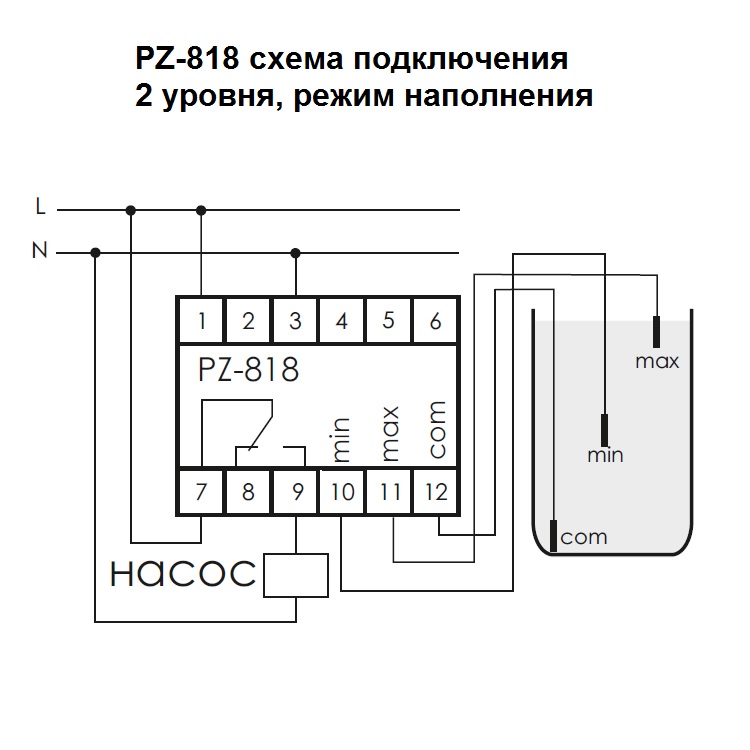 Реле контролирует наличие жидкости на двух уровнях. Режим наполнения резервуара: • Если уровень жидкости опускается ниже минимального, замыкаются контакты 7−9. При достижении верхнего уровня замыкаются контакты 7−8. Режим откачивания жидкости из резервуара (установлена перемычка между контактами 4−6). • Если уровень жидкости опускается ниже минимального, замыкаются контакты 7−8. При достижении верхнего уровня замыкаются контакты 7−9.