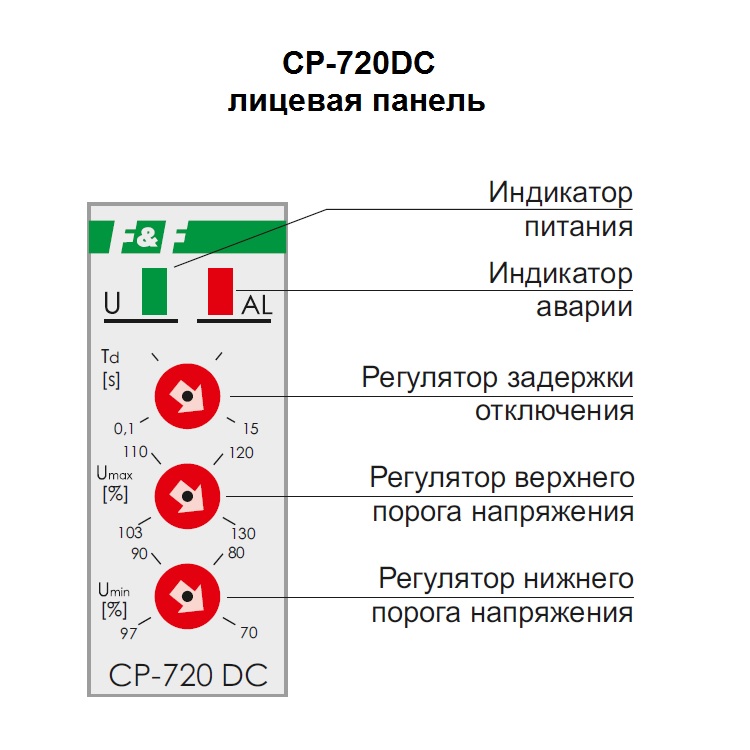 Реле контроля напряжения CP-720 DC предназначено для непрерывного контроля величины напряжения в однофазной сети постоянного тока и защиты электроустановок, электроприборов и прочего электронного оборудования от повышенного или пониженного напряжения питания, контроля напряжения в системах автоматики. Защита осуществляется путем отключения нагрузки от сети питания.