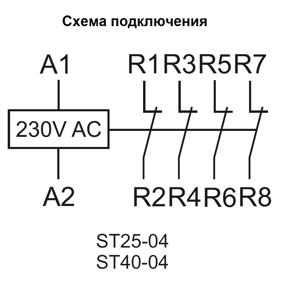Напряжение питания — 230 В, 50 Гц. Максимальный ток нагрузки — 25 А Контакты 4NC.