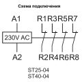 Подача управляющего напряжения на катушку контактора, приводит к переключению контактов. Положение контактов сигнализируется свечением красного светодиода. После отключения напряжения питания, контакты возвращаются в первоначальное положение.