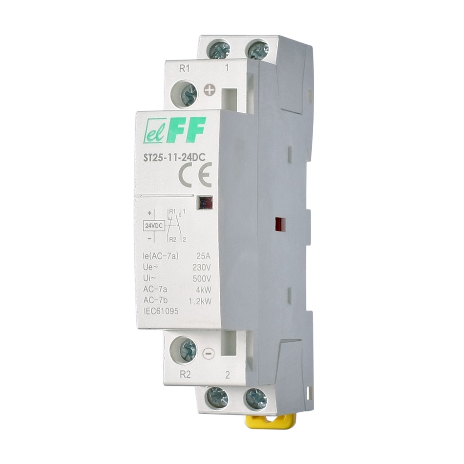 Напряжение питания — 24 В, DC. Максимальный ток нагрузки — 25 А Контакты 1NO+1NC.