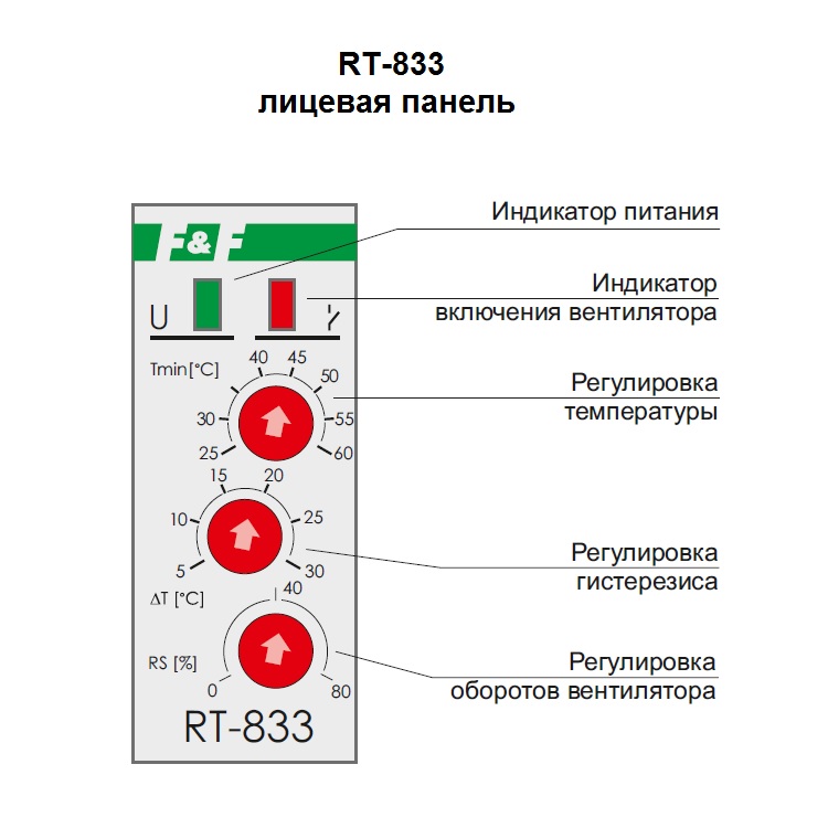 Регулятор температуры измеряет температуру выносным датчиком температуры и включает/выключает вентилятор, обороты вращения которого пропорциональны измеряемой температуре в пределах заданного температурного диапазона. При температуре в зоне температурного контроля, равном выбранному значению, коллекторный выход транзистора терморегулятора управляет работой вентилятора на минимальных оборотах. При увеличении температуры на величину установки гистерезиса обороты вентилятора увеличиваются в интервале от 0 до 80% от максимальной скорости вращения вентилятора, пропорционально росту температуры. При достижении температуры, равной сумме выбранного значения температуры и достигнутого значения гистерезиса, обороты вращения вентилятора охлаждения равны 100%. При превышении и дальнейшем росте температуры (сумма температуры контроля и гистерезиса) в течение более трех минут осуществляется включение контактной группы реле аварийной сигнализации (гальванически развязана, ток контакта 10 А). При снижении температурного режима на величину ниже установленной на терморегуляторе, регулятор температуры отключает вентилятор охлаждения.