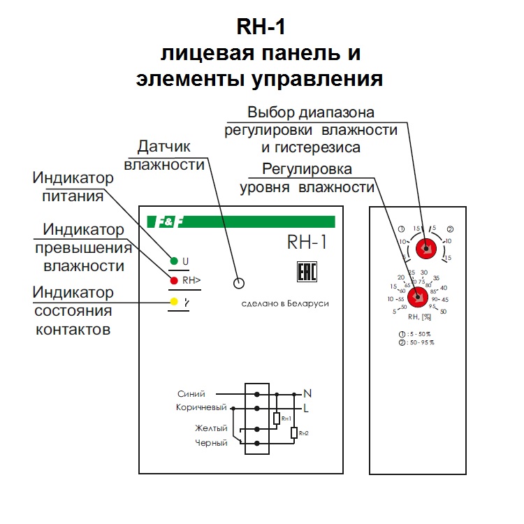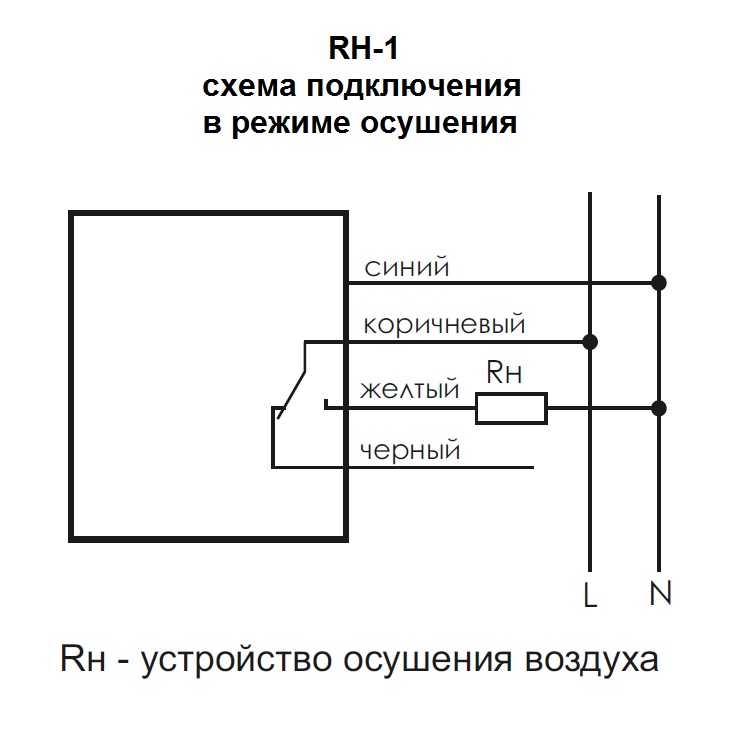 Уровень влажности воздуха задаётся потенциометром. Влажность измеряется встроенным цифровым датчиком. Если влажность выше установленного значения, замыкаются контакты исполнительного реле, включается осушитель воздуха (подключен к синему и желтому проводам). При снижении уровня влажности контакты реле переключаются (замыкаются контакты, подключенные к синему и черному проводам). Реле влажности может работать в режиме осушения воздуха или в режиме увлажнения воздуха.