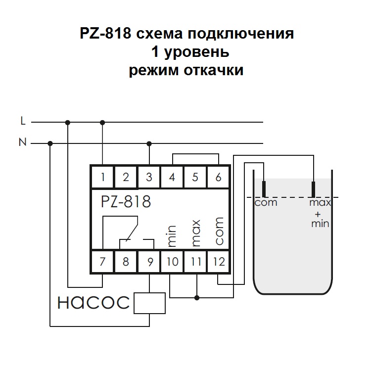 Реле контролирует наличие жидкости на двух уровнях. Режим наполнения резервуара: • Если уровень жидкости опускается ниже минимального, замыкаются контакты 7−9. При достижении верхнего уровня замыкаются контакты 7−8. Режим откачивания жидкости из резервуара (установлена перемычка между контактами 4−6). • Если уровень жидкости опускается ниже минимального, замыкаются контакты 7−8. При достижении верхнего уровня замыкаются контакты 7−9.