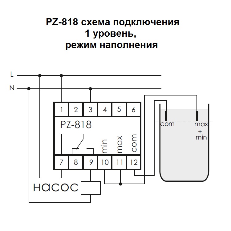 Реле контролирует наличие жидкости на двух уровнях. Режим наполнения резервуара: • Если уровень жидкости опускается ниже минимального, замыкаются контакты 7−9. При достижении верхнего уровня замыкаются контакты 7−8. Режим откачивания жидкости из резервуара (установлена перемычка между контактами 4−6). • Если уровень жидкости опускается ниже минимального, замыкаются контакты 7−8. При достижении верхнего уровня замыкаются контакты 7−9.