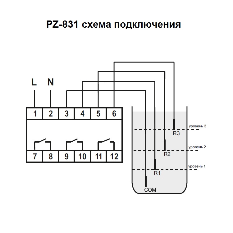 Работа реле основана на измерении сопротивления электропроводящих жидкостей между общим зондом (СОМ) и зондами 3 уровней (R1, R2, R3). При соединении жидкостью общего зонда с любым из оставшихся зондов происходит переключение соответствующего выходного реле. Например, если расположить зонды трёх уровней (R1, R2, R3) на различной высоте относительно дна резервуара (как на диаграмме), каждое из выходных реле будет сигнализировать о достижении жидкостью соответствующего уровня (этим сигналом можно включать какое-то дополнительное оборудование). Если же расположить зонды 3 уровней (R1, R2, R3) в 3 различных резервуарах, то можно независимо фиксировать достижение определённого уровня жидкости в каждом из них. При этом необходимо в каждом из резервуаров установить по отдельному общему зонду (СОМ) и соединить их с клеммой 3 реле.